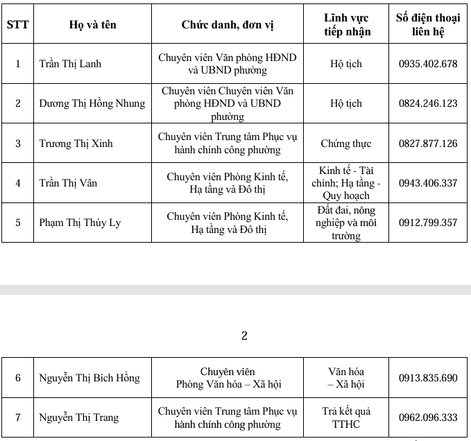 Trung tâm Phục vụ hành chính công phường thông báo công khai thông tin, số điện thoại liên hệ của các công chức được giao nhiệm vụ tiếp nhận hồ sơ và trả kết quả thủ tục hành chính tại Trung tâm để các cơ quan, đơn vị, tổ chức, cá nhân được biết và liên hệ: